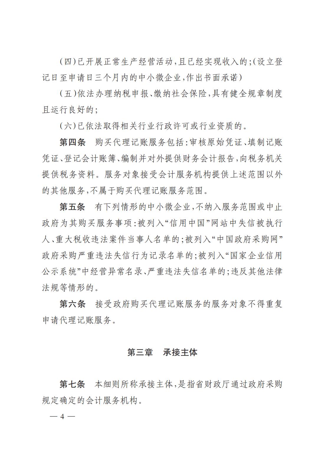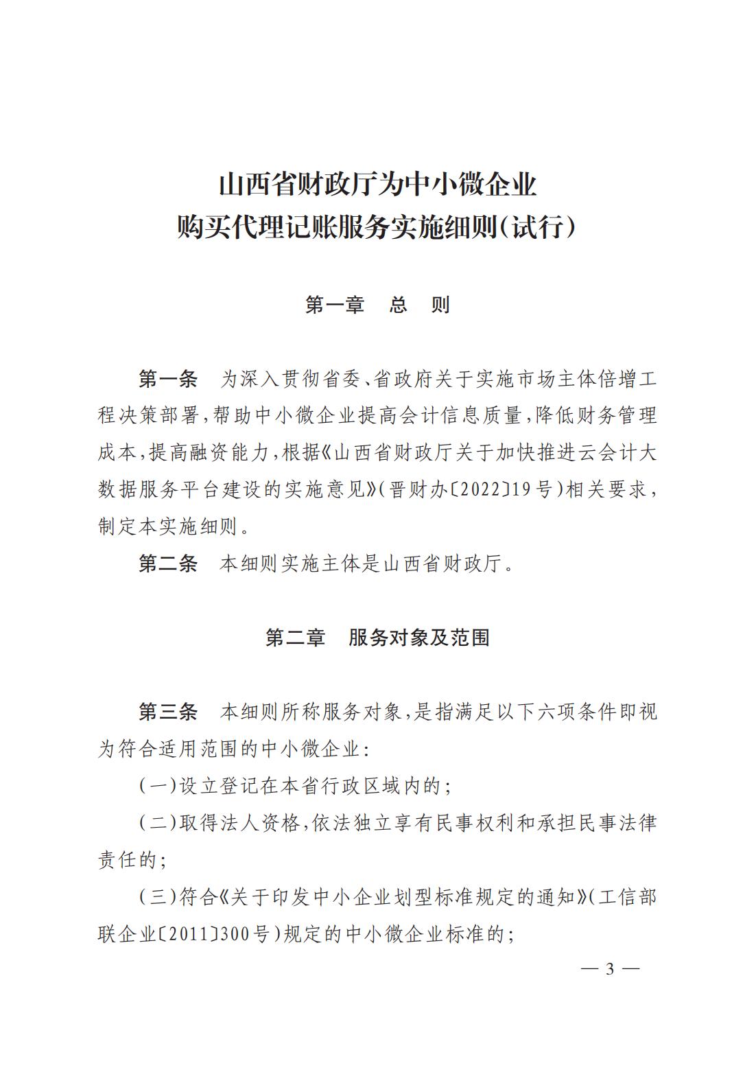 為進(jìn)一步支持全省中小微企業(yè)持續(xù)快速健康發(fā)展,切實(shí)加強(qiáng)和改進(jìn)會計(jì)服務(wù)能力,根據(jù)《山西省人民政府辦公廳關(guān)于印發(fā)強(qiáng)化市場主體倍增要素服務(wù)保障若干措施(試行)的通知》(晉政辦發(fā)〔2022〕7 號)、《山西省財(cái)政廳關(guān)于加快推進(jìn)云會計(jì)大數(shù)據(jù)服務(wù)平臺建設(shè)的實(shí)施意見》(晉財(cái)辦〔2022〕19 號)文件要求,省財(cái)政廳研究制定了《山西省財(cái)政廳為中小微企業(yè)購買代理記賬服務(wù)實(shí)施細(xì)則(試行)》,現(xiàn)予以印發(fā),請結(jié)合工作實(shí)際,認(rèn)真抓好貫徹落實(shí)。